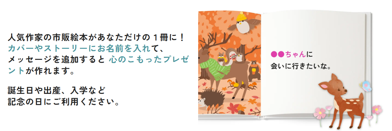 絵本を開いた瞬間、「これ、ぼくの名前だ!」とお子さまが喜ぶその表情は、かけがえのない思い出になるはずです。