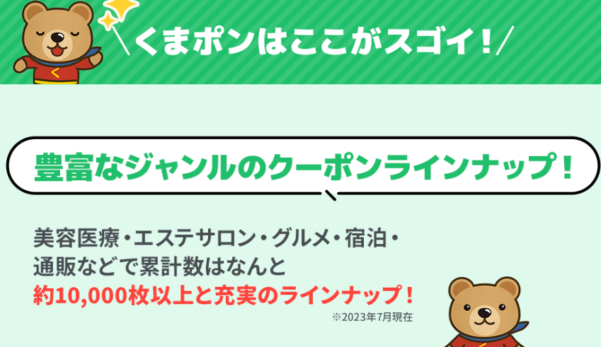 - ジャンル豊富:美容、リラク、グルメ、旅行、通販までカバー。