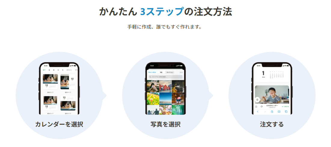 - 写真選択 → デザイン選択 → 注文 の最短3ステップで完成。