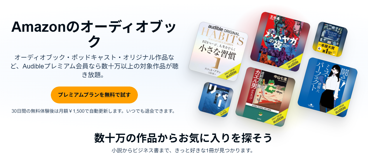 Audibleのプレミアムプランは、月額1,500円(税込)で対象作品が聴き放題。
