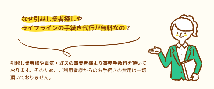 - 提携する引越し業者・ライフライン会社からの手数料で運営